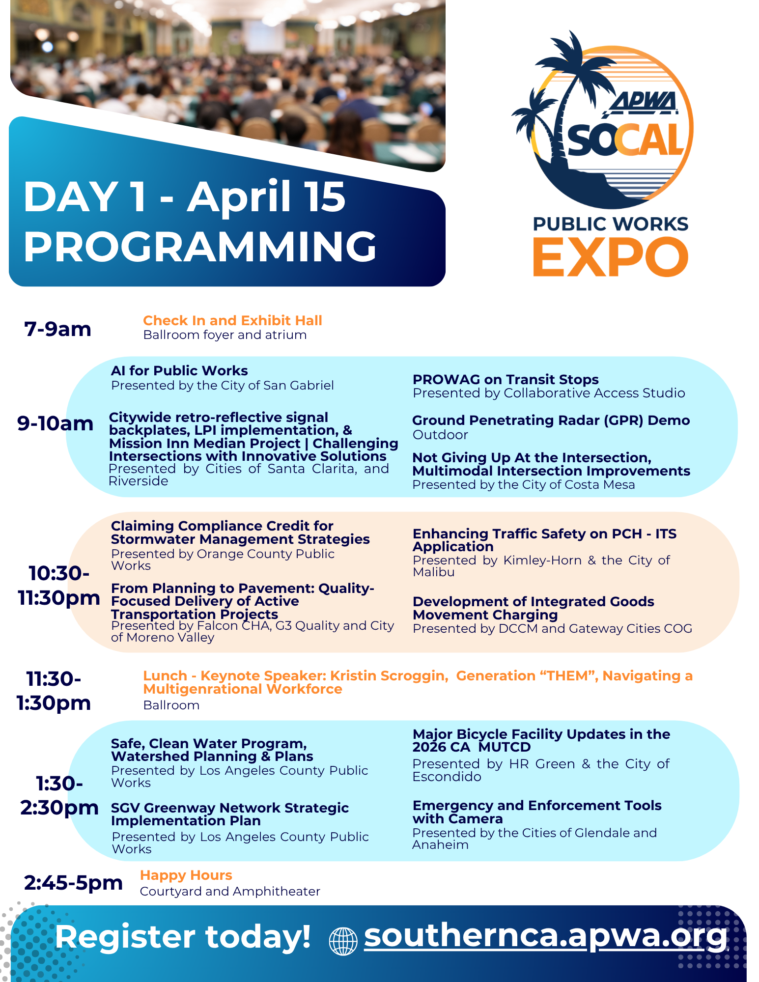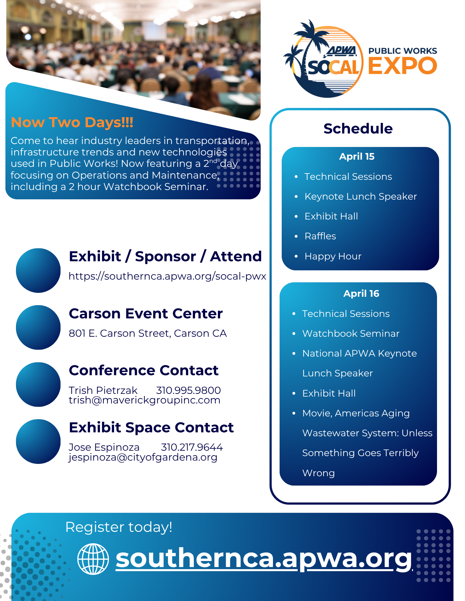 Whether you’re responsible for planning, managing, maintaining, or supporting public infrastructure, the APWA SoCal Public Works Expo is your opportunity to learn, connect, and be inspired—while strengthening the public works community that serves Southern California every day.
