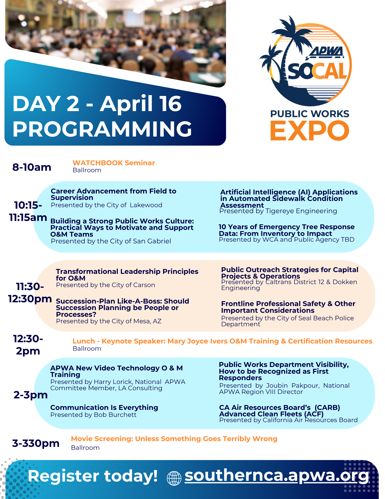 We’re excited to introduce several new features this year, including an expanded two-day program, with Day Two focused on Operations and Maintenance. This day will feature practical, hands-on sessions tailored to professionals responsible for keeping public works systems operating safely, efficiently, and reliably. In addition, the Watchbook Seminar will be held during a dedicated two-hour session on Day Two, offering valuable training and insights on leadership and traffic control in public works.